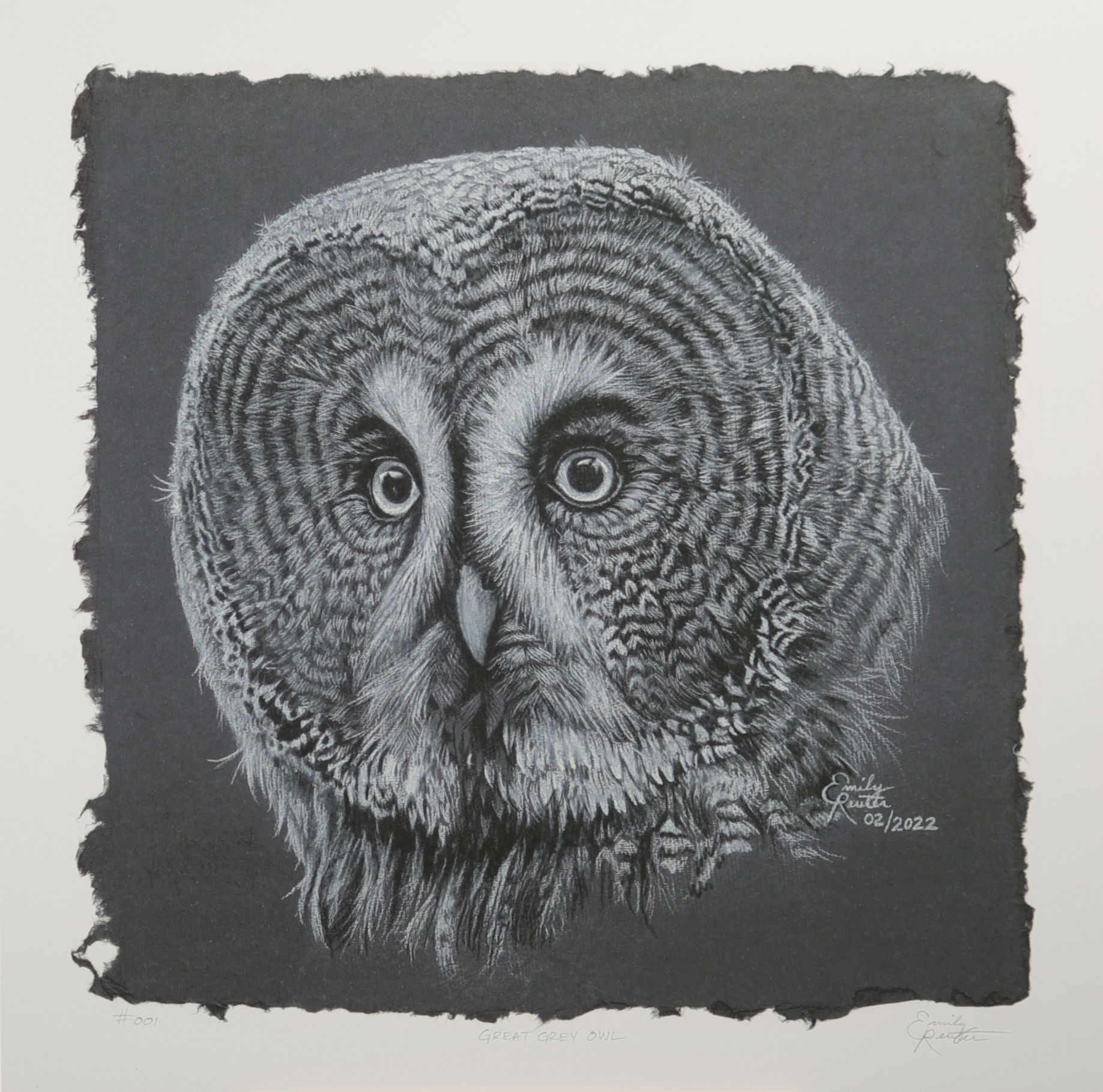 The wise face of a Great Grey Owl. I’ve always loved how they look like they are in a grey suit with a white bowtie! This was the second in the owl series on recycled, toned and deckle edge paper.