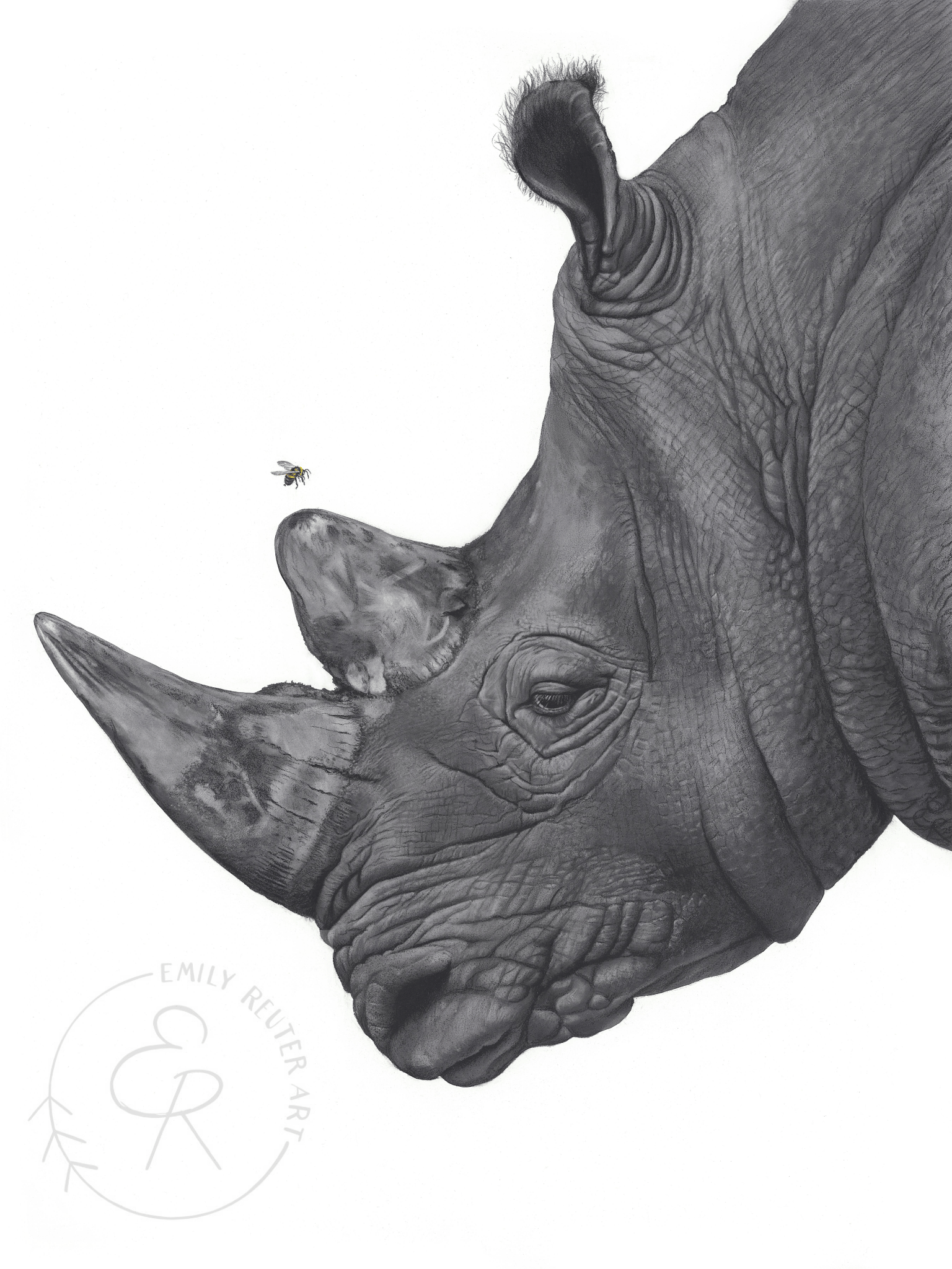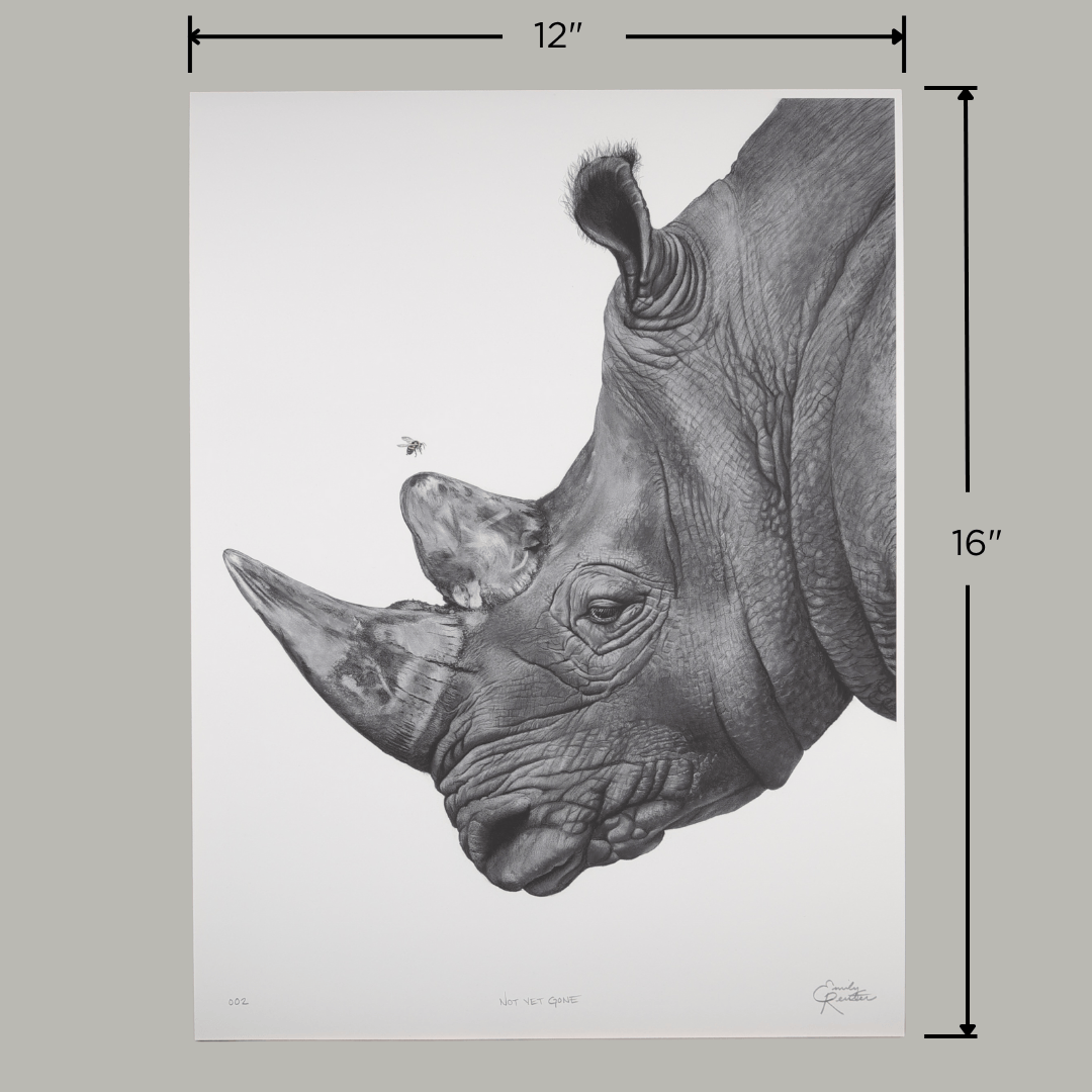 Harmon anchors the piece as a living ambassador for a species facing extinction through poaching and habitat loss. Above him, the bumblebee, a federally endangered Midwest native represents local action and fragile hope. Their shared space suggests that global and local conservation are not separate struggles, but intertwined threads in the fabric of ecological care.